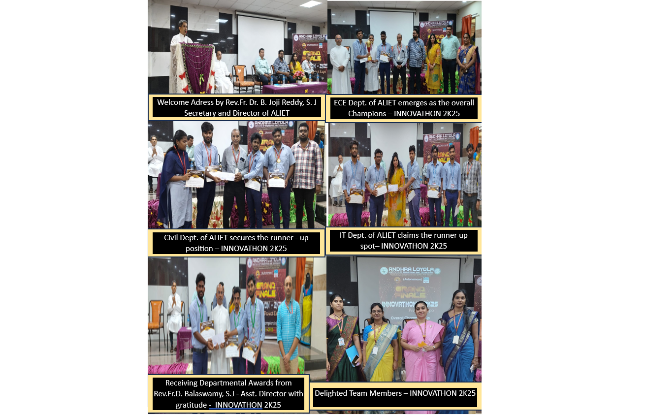 The highlight of the ceremony was the announcement of the Overall Champion, which was announced by Rev. Fr. Dr. B. Joji Reddy, S.J., Secretary and Director Rev. Fr. D. Balaswamy, S.J., Assistant Director. The Championship award was bagged by the ECE Department of ALIET for their project, entitled “Personal Assistance DH Women Safety”. The team received the Rolling Shield, along with medals, certificates, and a cash prize of ₹5,000. The runner-up positions were tied between the Civil Engineering Department for the project entitled Hydro Renewable Energy Power and IT Department Kisan Harith Mithra project, both receiving medals, certificates, and a cash prize of ₹2,500. Departmental winners were also awarded cash prizes, with ₹3,000 for first place, ₹1,000 for second place, and ₹500 for third place, in addition to medals and certificates.